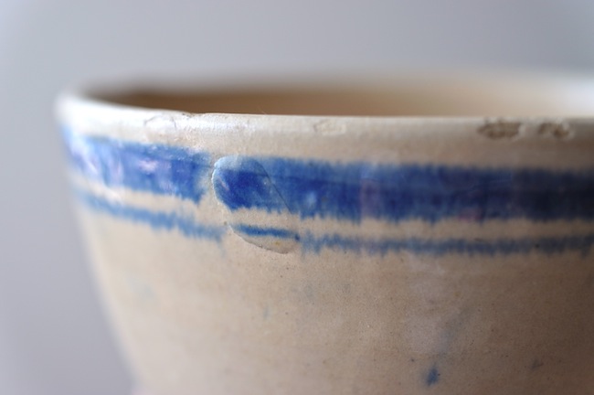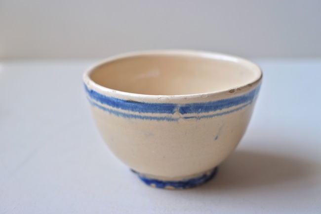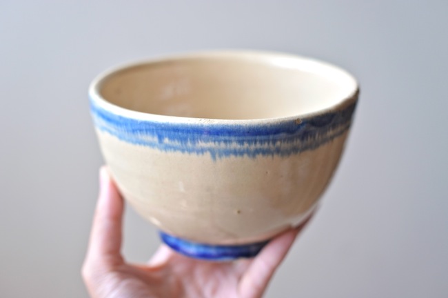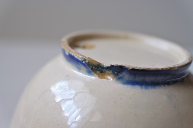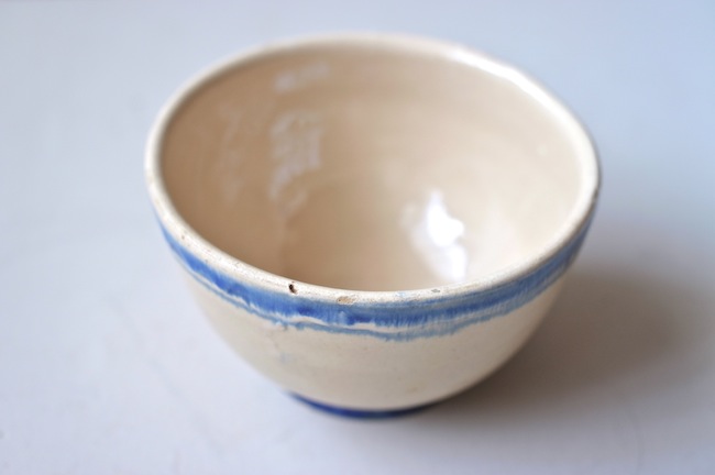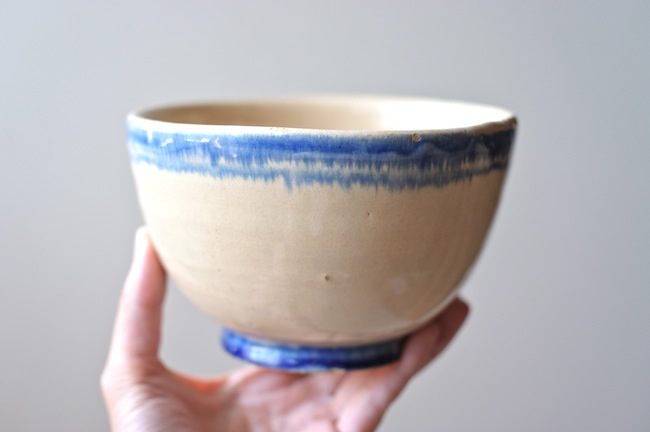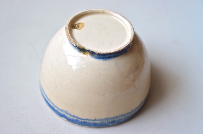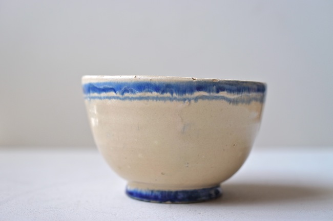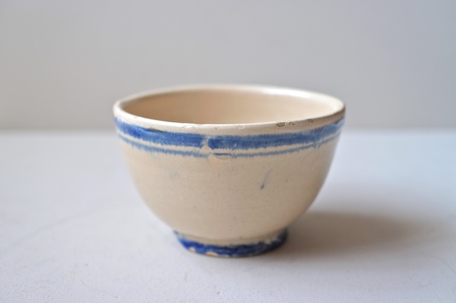 南イタリアのブルーのラインの入っているボウル。カフェオレボウルの形ですが、器として使ったのでしょう。おそらくプーリア州のものです。ぼってりと厚みはありますが、意外に軽いです。縁に釉薬が剥げているところがあります。高台に欠けがあるのですが、上から色づけされているので、器が焼かれたときのものでしょう。なんとも素朴なボウルです。
