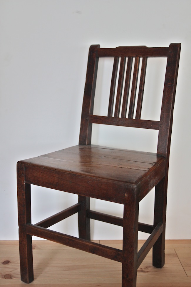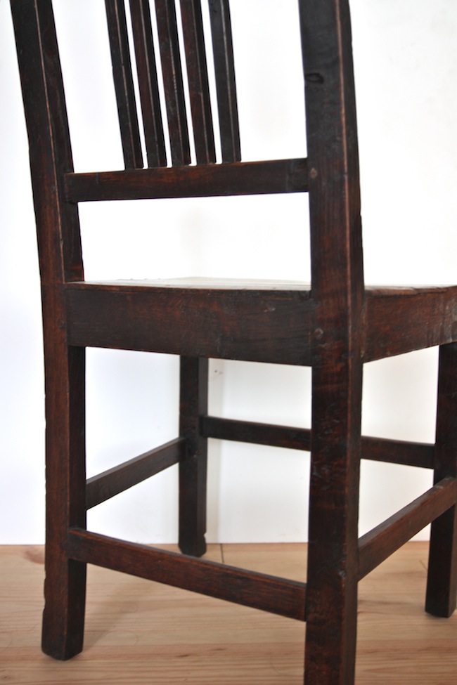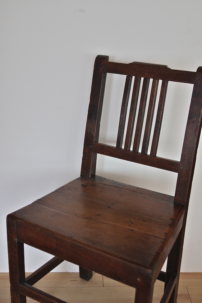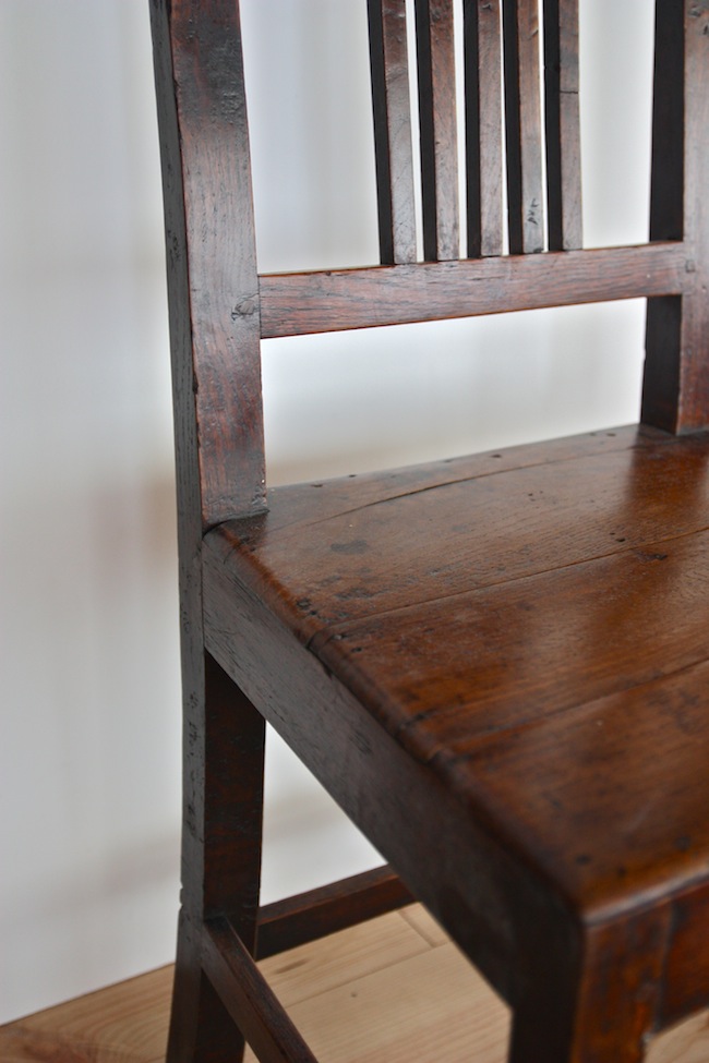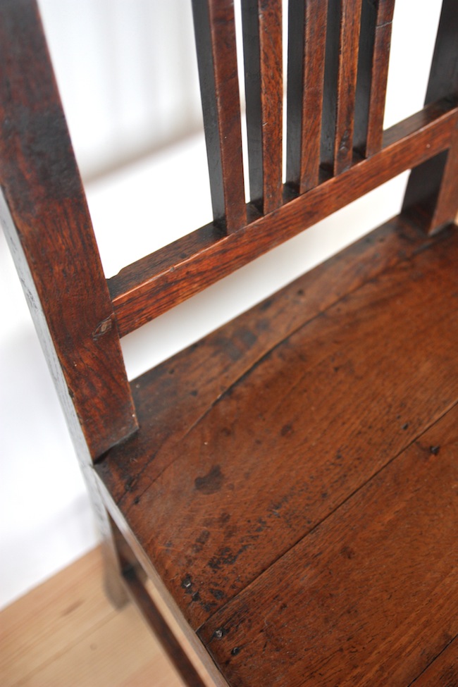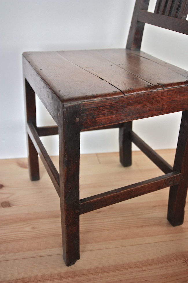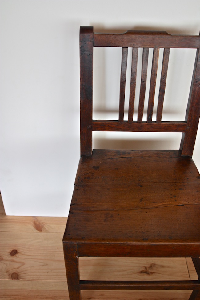 通常、数種類の木材を組み合わせて作られることが多いカントリーチェアですが、この椅子はすべて良質のオーク材で組まれています。イギリス東部のものだと思われます。部分的な修復痕があるものの、組み直し等の大掛かりなレストレーションが施された形跡はなく、ジョイントにはオリジナルと思われる角ペグが残されています。