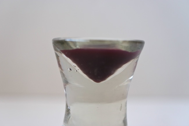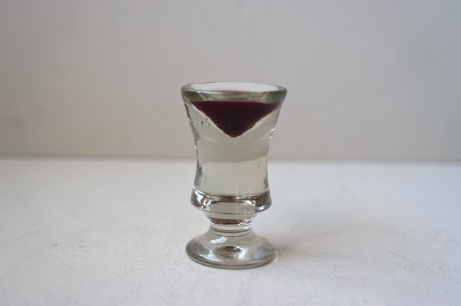 珍しい形をしたイタリアの厚底リキュールグラス。ガラスの塊のようなグラスです。リキュールは少量しか入りませんが、色のついているものを注ぐと凹みが綺麗にV字型に見えます。気泡や歪みがあり、ずっしりと重たく、存在感のあるグラスです。