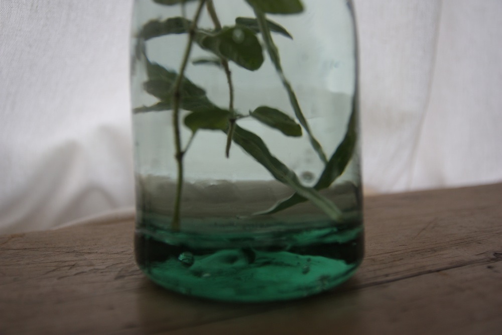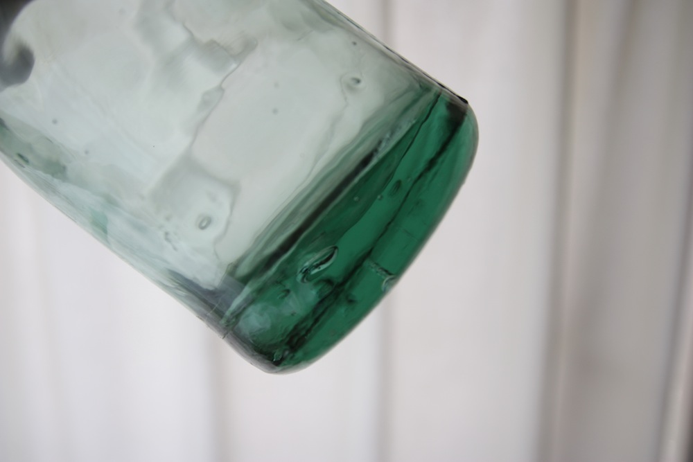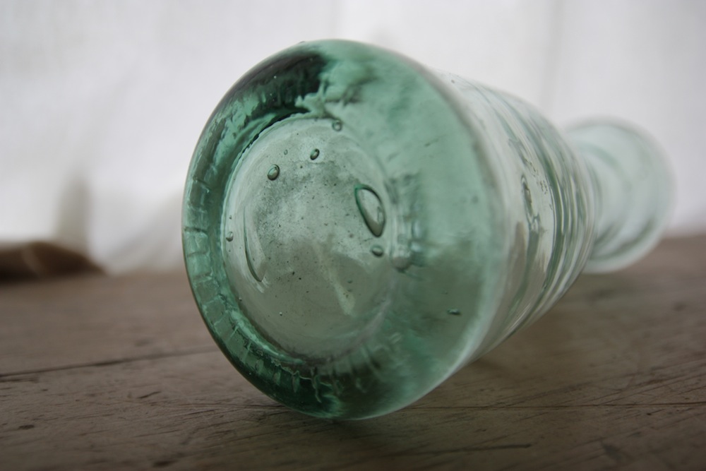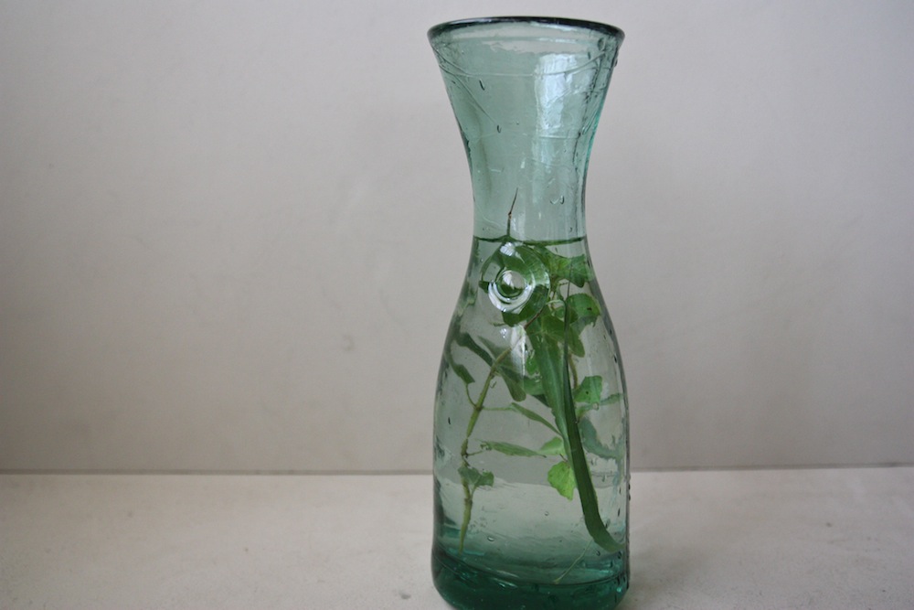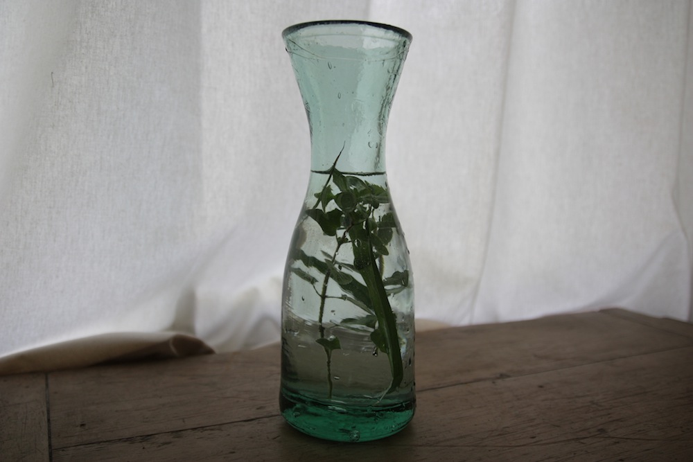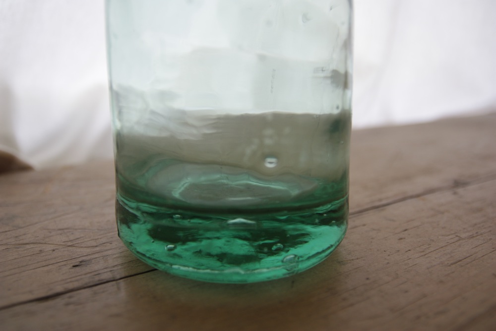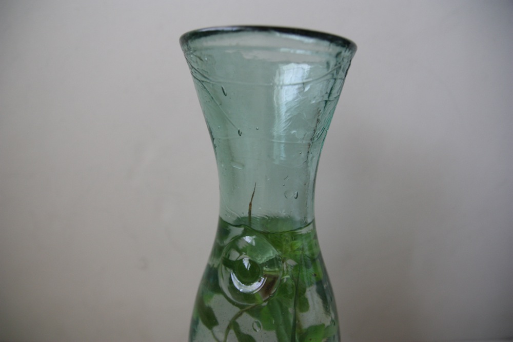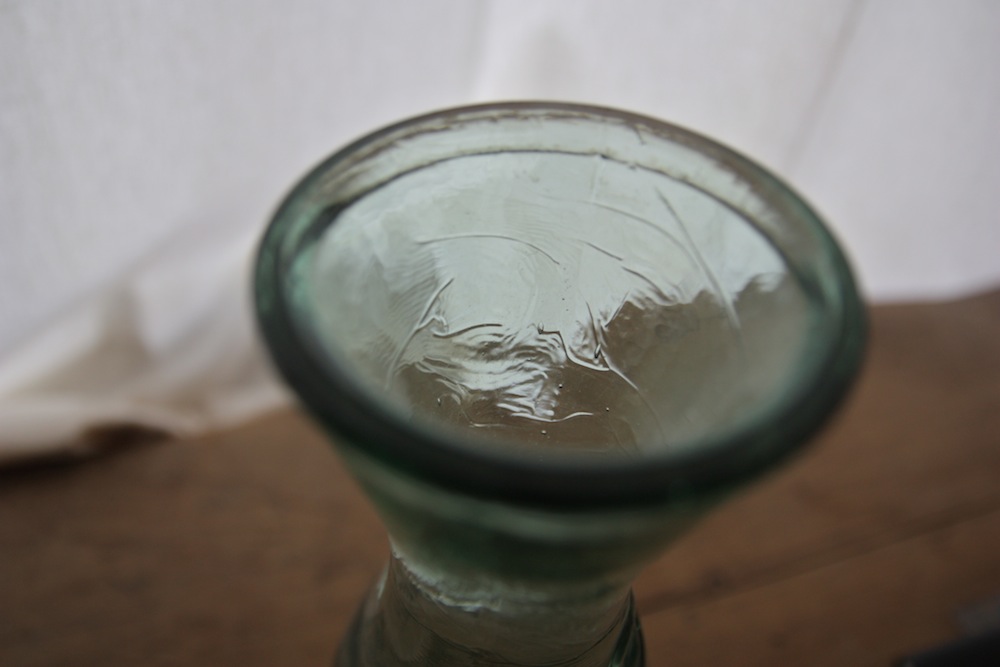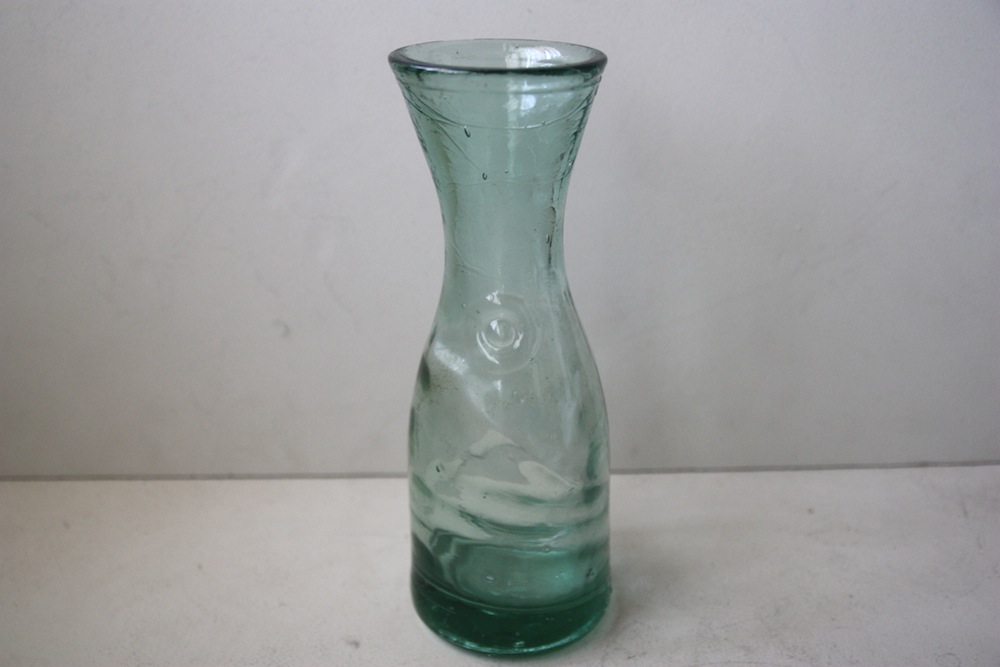 戦後のプレスグラスのガラスのデキャンタです。淡い青緑色で分厚いガラスです。気泡が沢山入っています。ワインはもちろん、ハーブウォーターなど入れても爽やか。イタリア。