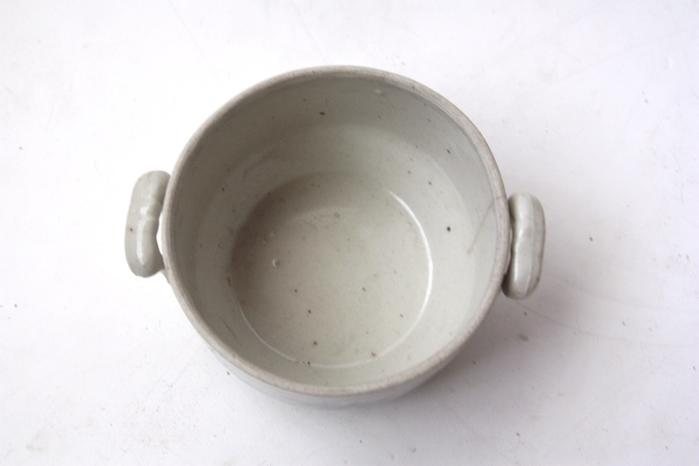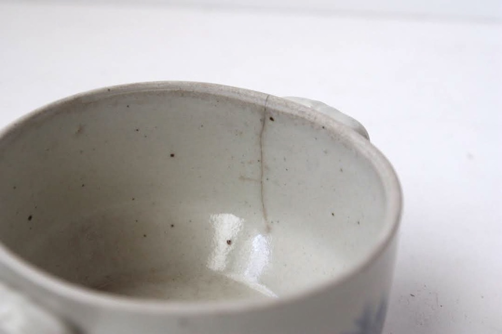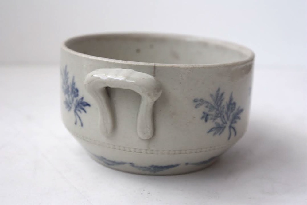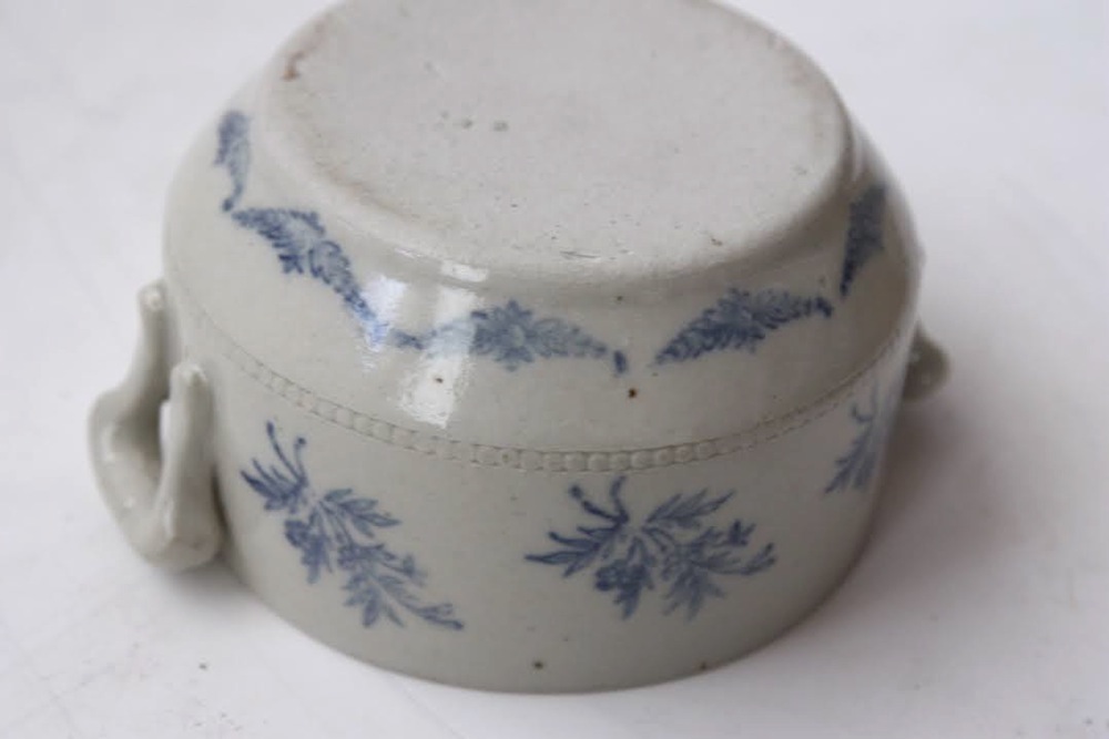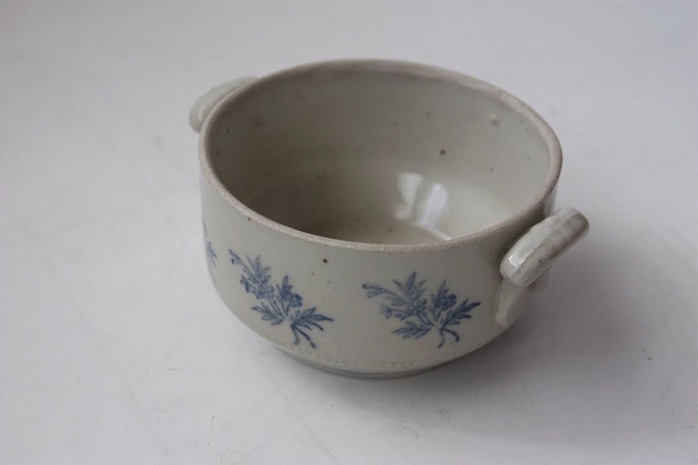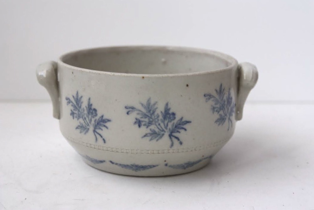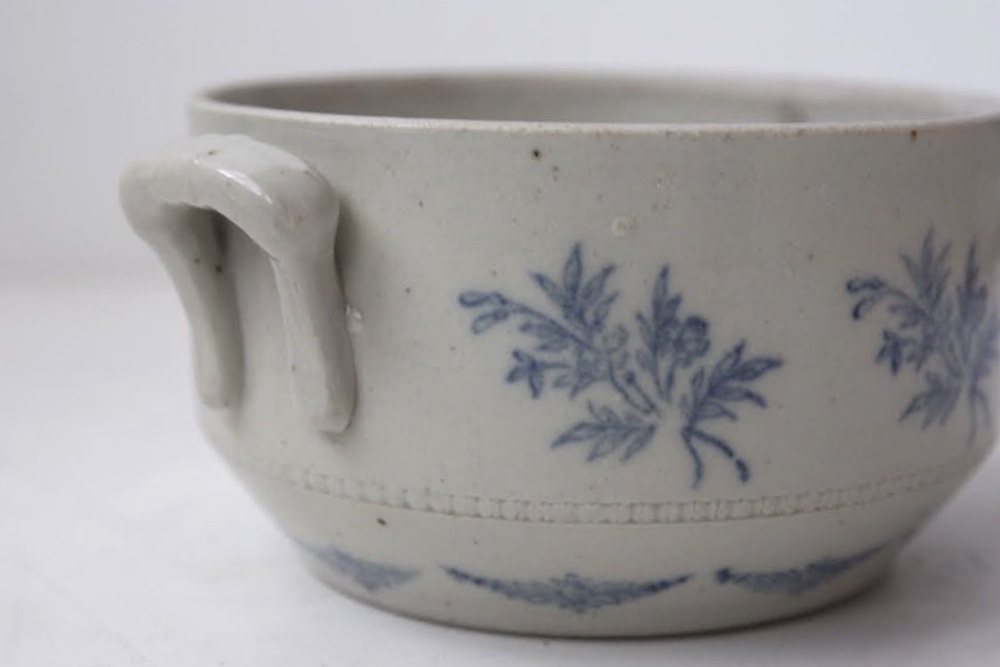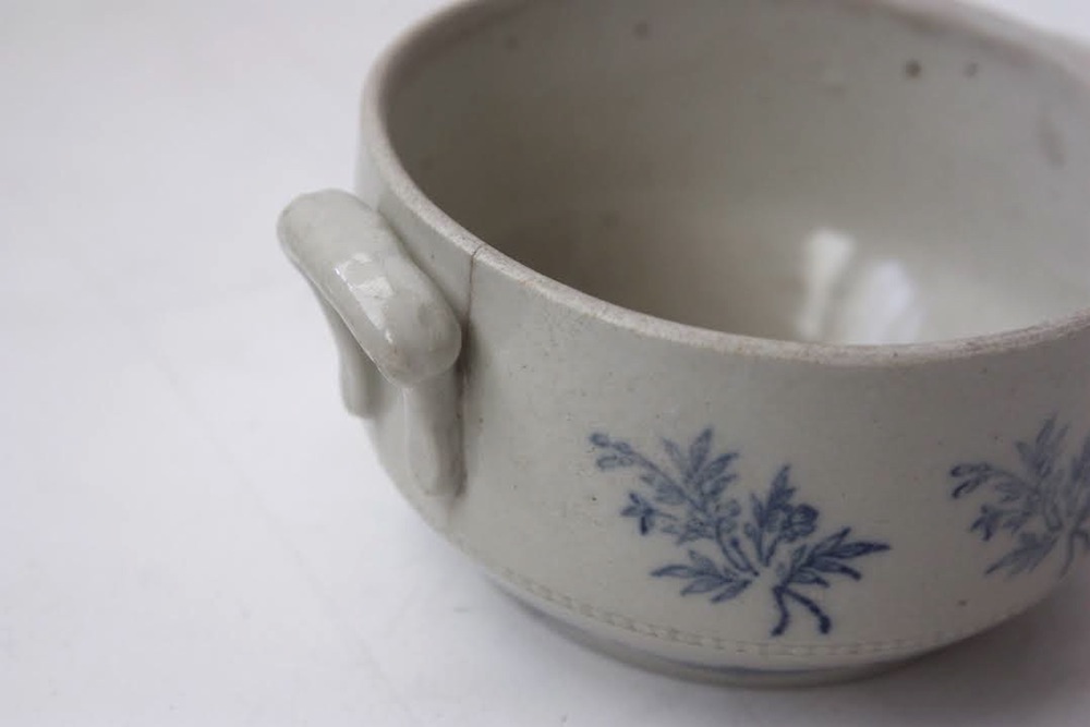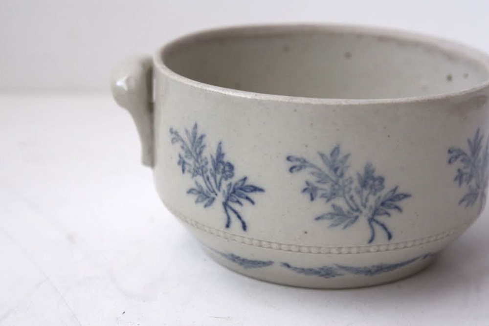 フランスSaint-Uzeのパテ、テリーヌ用の容器です。スタンプを押したような落ち着いたブルーの花柄に、地色はライトグレー。一カ所へアラインが入っていますので(画像でご確認ください)オーブンに入れたり、火にかけないでください。内側に製造時にできたホツ(黒い点)があります。1900年代はじめ。