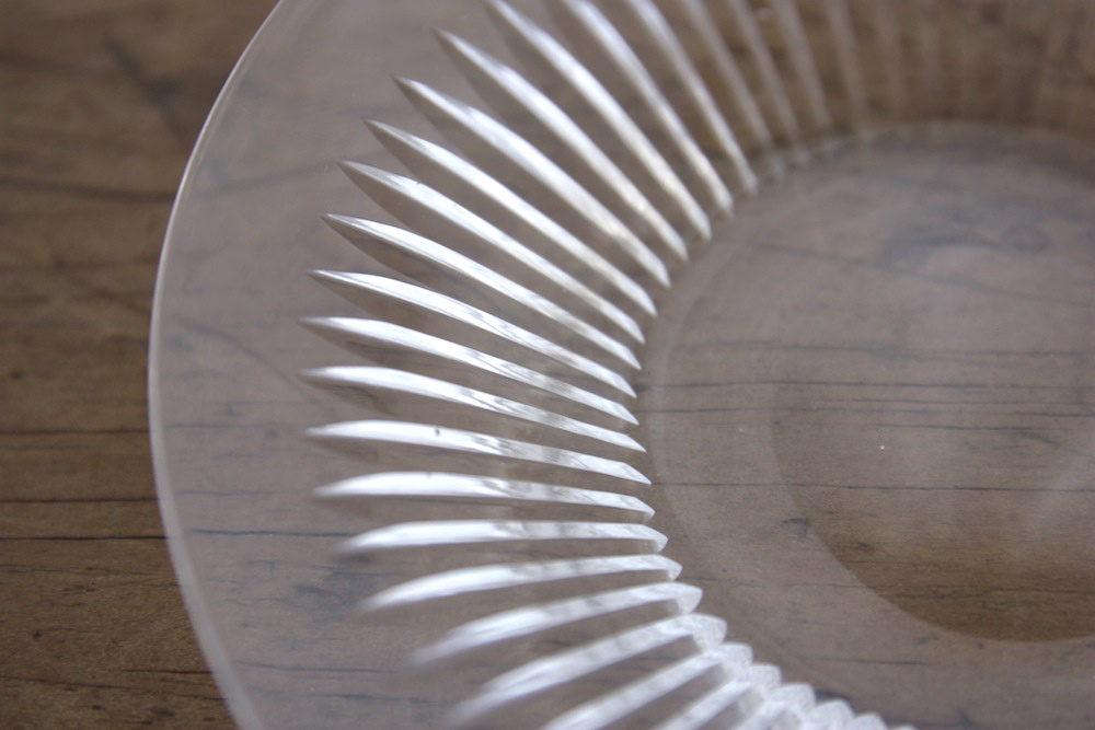 1930年代イギリスのハンドカットグラスのお皿。おそらくTUDOR社(チューダー社)のデザート皿だと思います。表面に使用痕がありますが、欠けやヒビなどの目立つダメージは見られません。