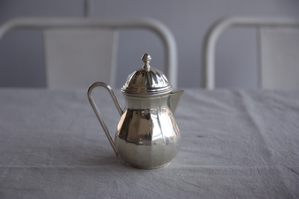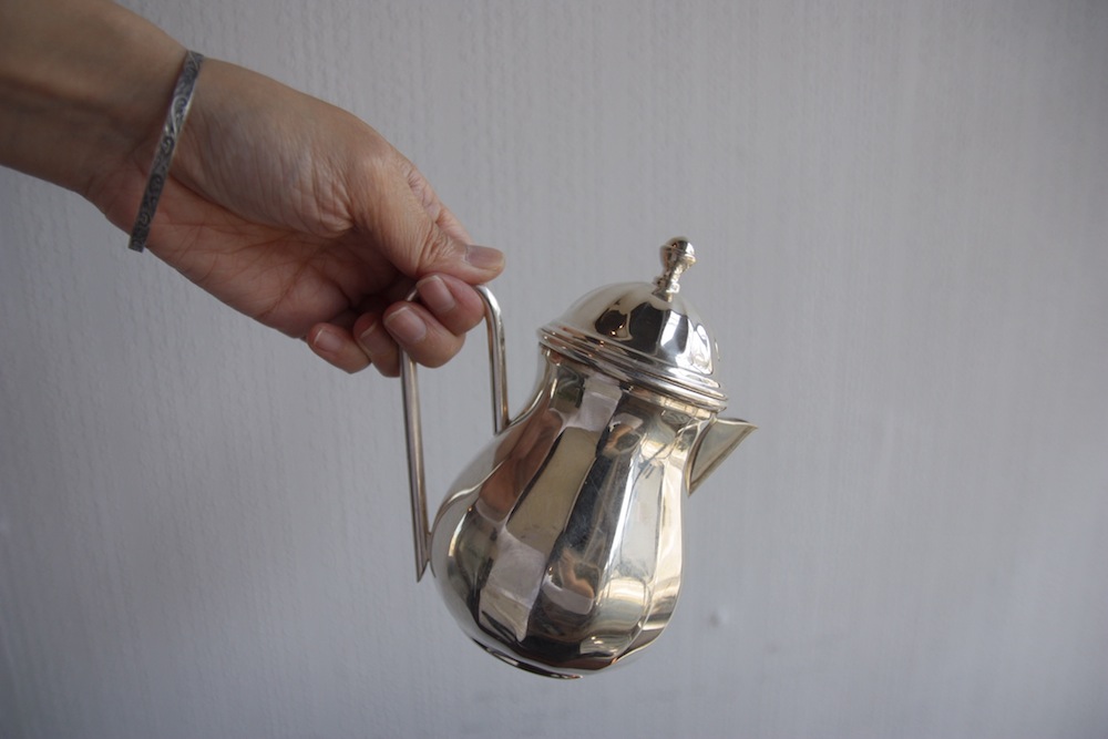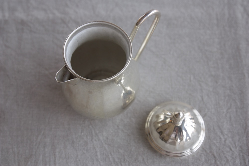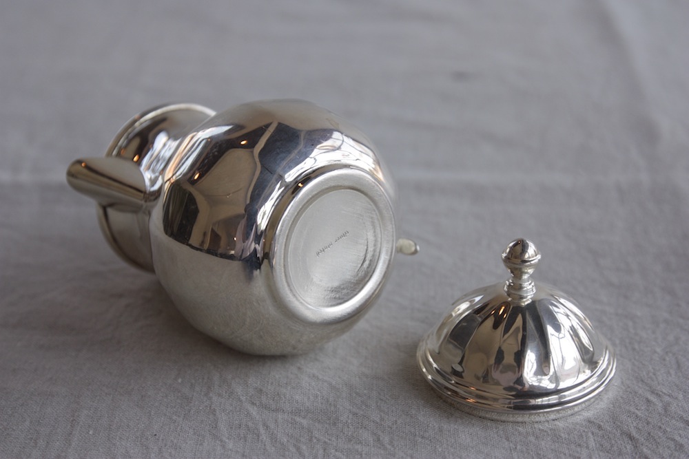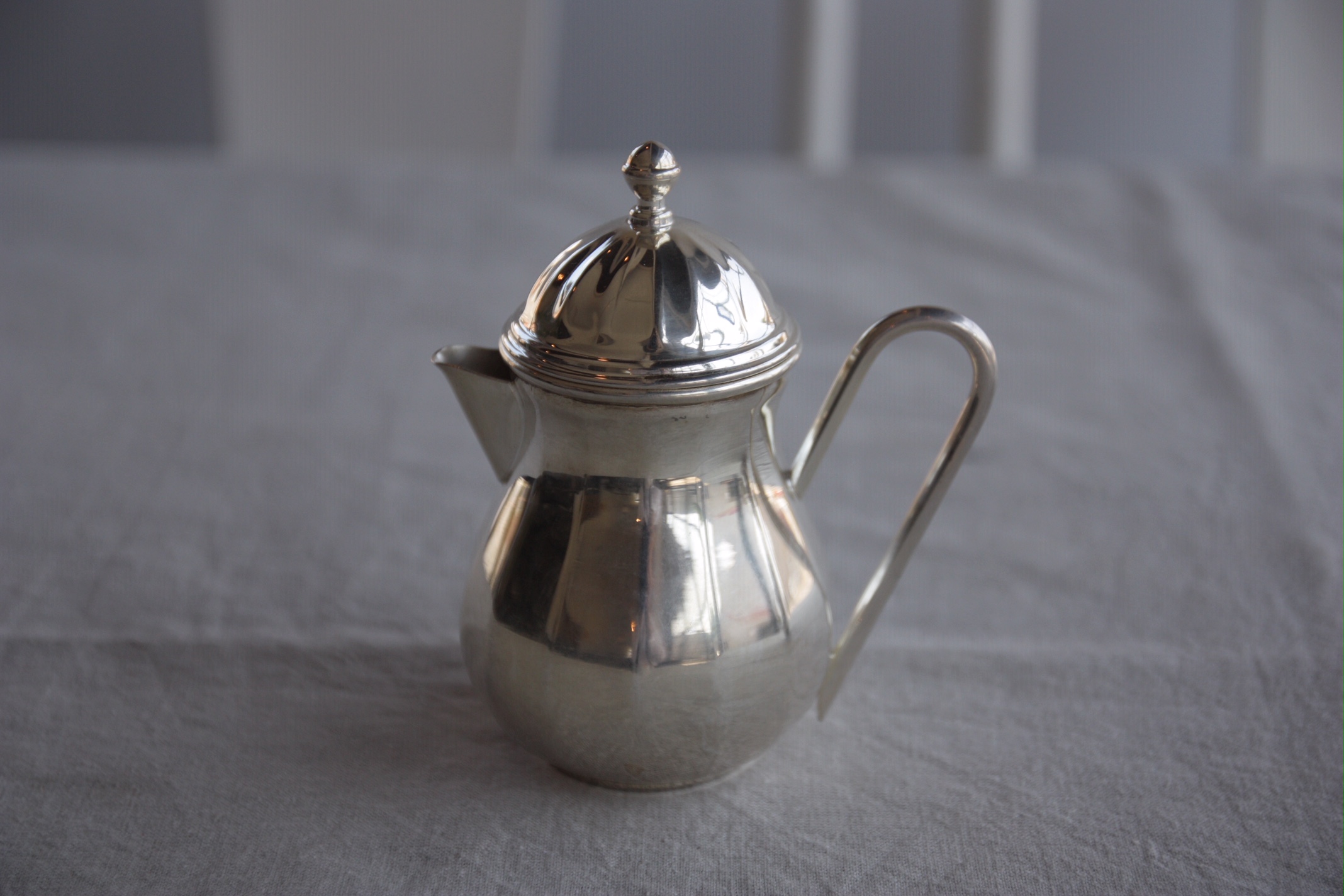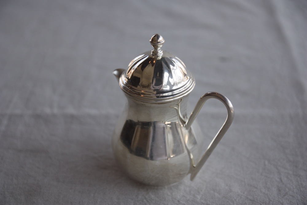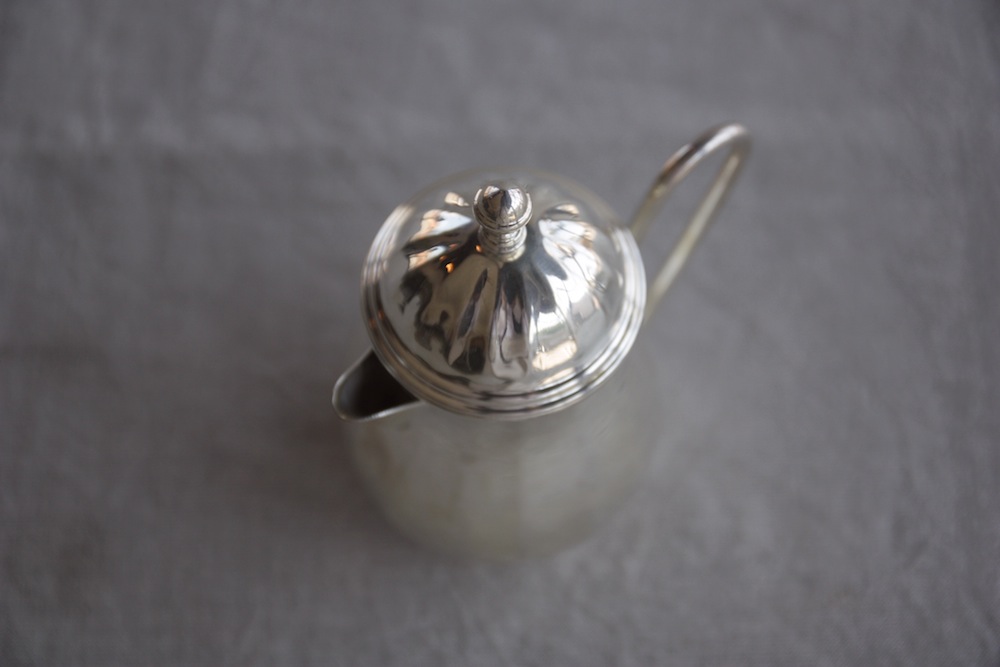 小さなサイズのシルバープレートのポットです。一人用のティーポット、中国茶器、ミルクポット(クリーマー)としてお使いいただけます。軽くて使いやすいと思います。