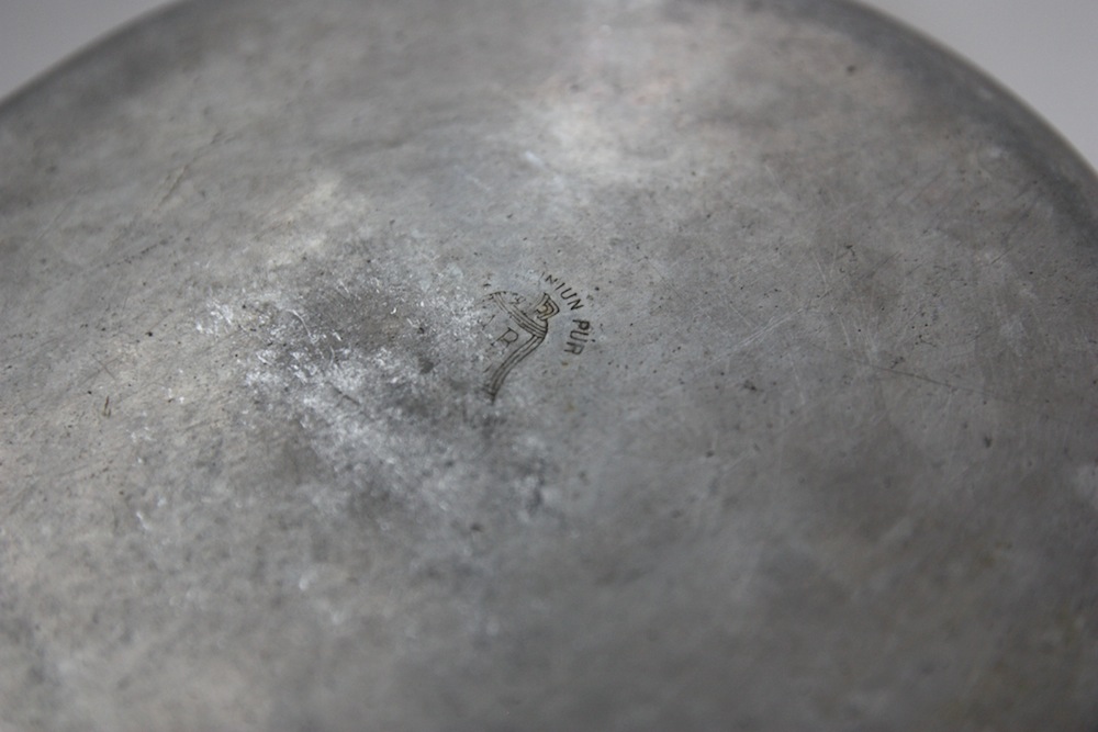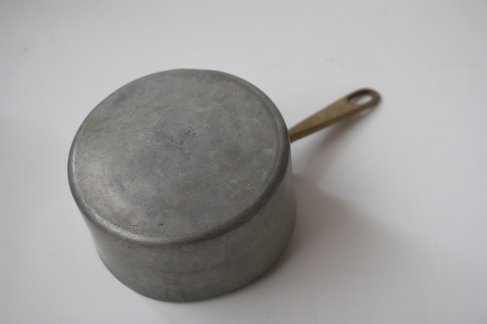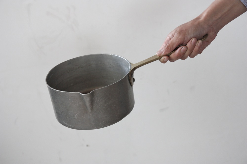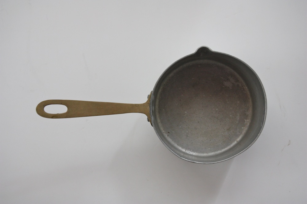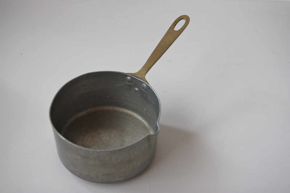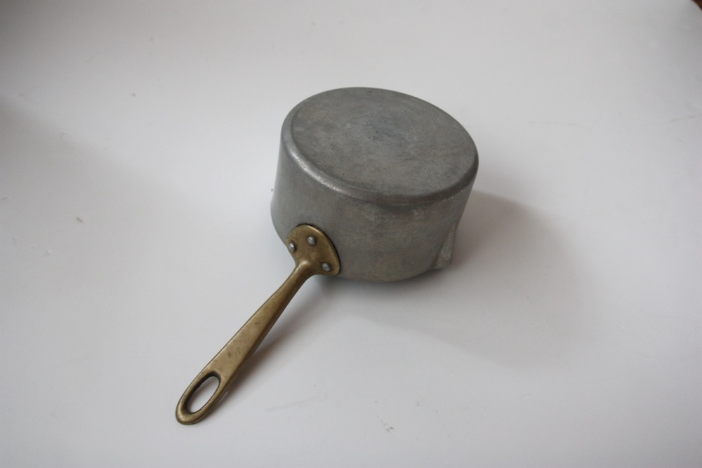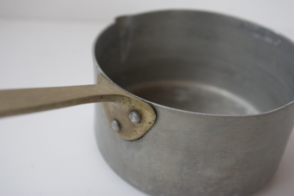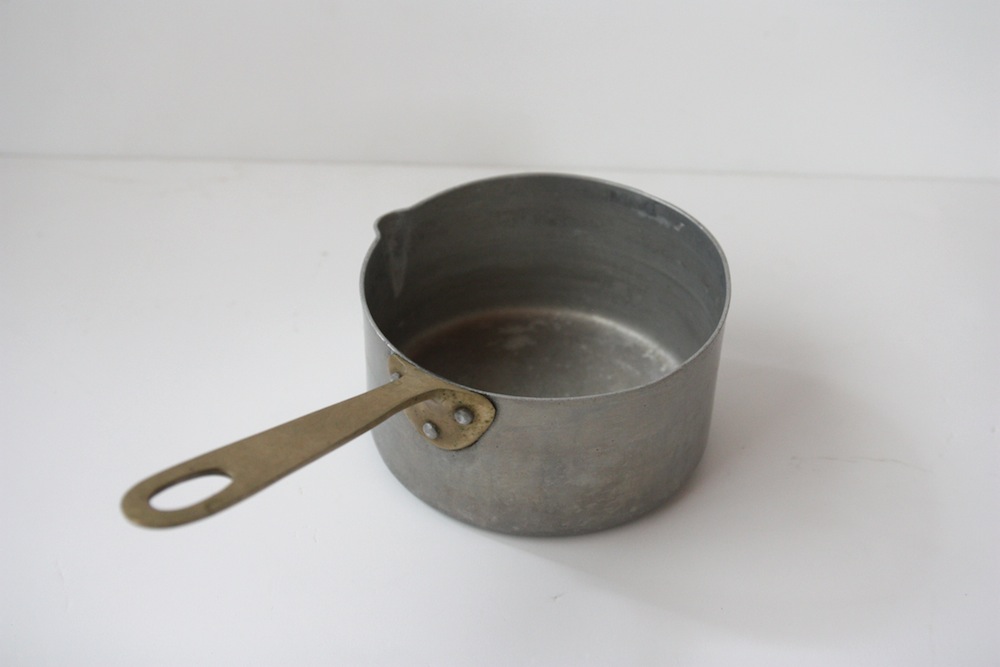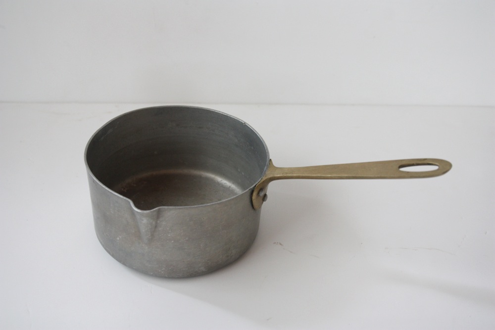 注ぎ口のついたフランスのアルミ製鍋。取手は真鍮製で熱くなります。とても使い勝手のよいサイズです。裏にスタンプ(刻印)あり。傷、変色等ありますが、使用に問題はありません。古いアルミの独特な素材感、凹みや歪みがお好きな方に。